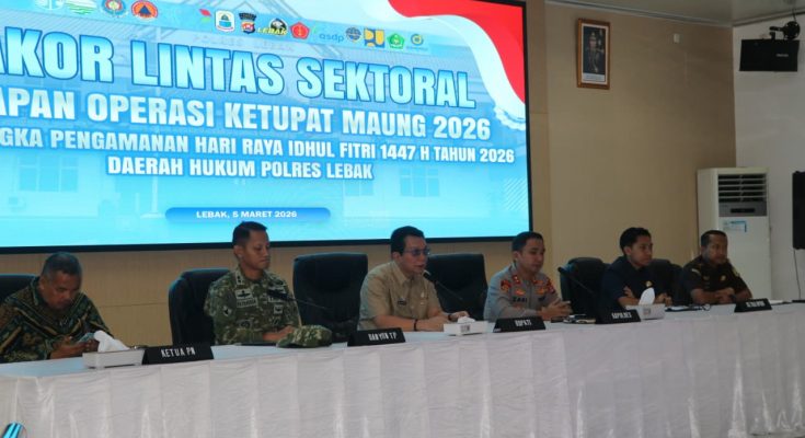 Lebak, ADN.COM – Kapolres Lebak Polda Banten AKBP Herfio Zaki, S.I.K., M.H. bersama Forkopimda Kabupaten Lebak menggelar Rapat Koordinasi (Rakor) Lintas Sektoral dalam rangka kesiapan Operasi Ketupat Maung 2026 untuk pengamanan Hari Raya Idul Fitri 1447 H di Aula Sanika Satyawada Polres Lebak, Kamis (5/3/2026).