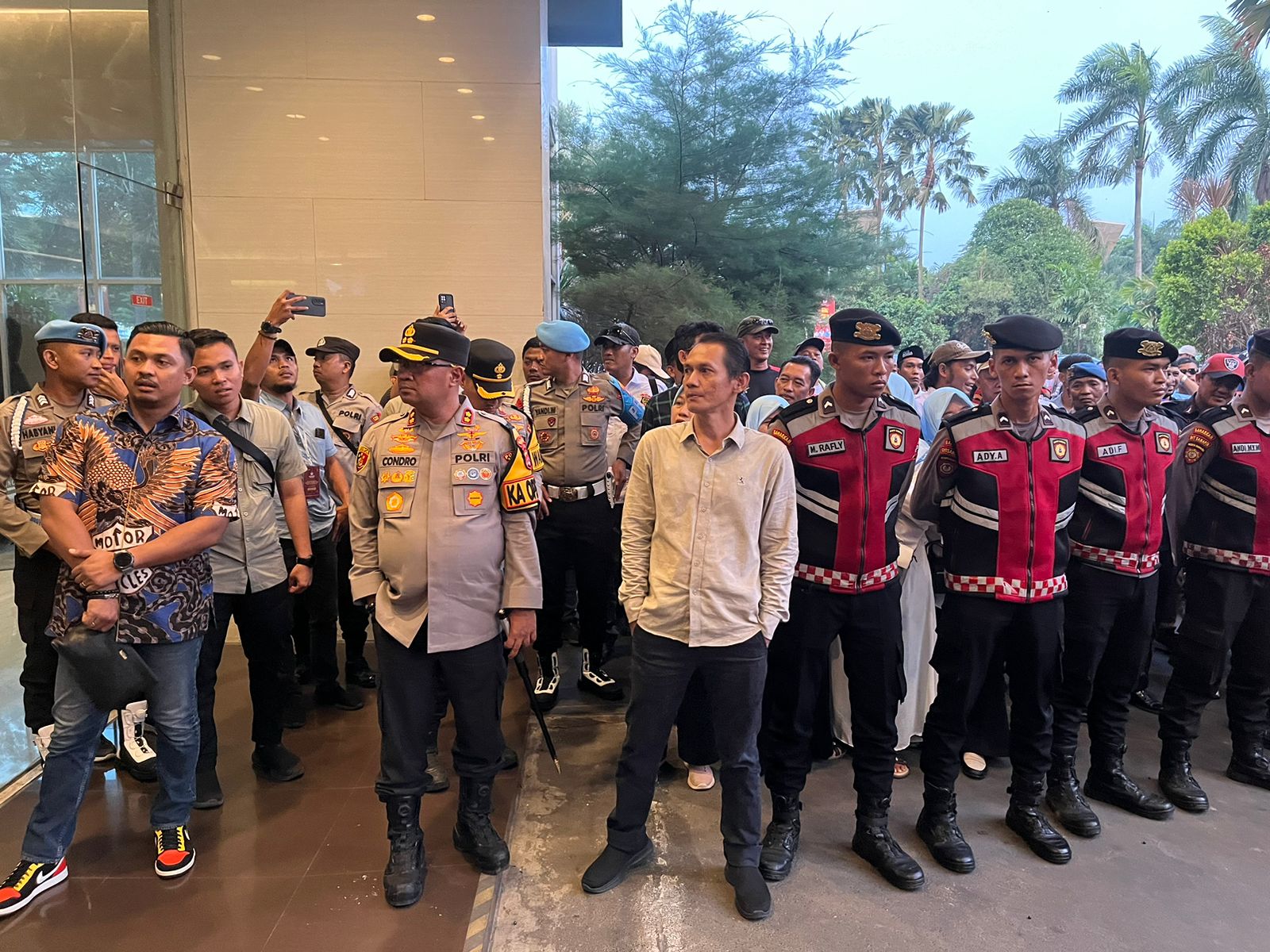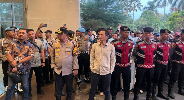 SERANG,ADN.COM – Ratusan personil kepolisian dari Polres Serang di kerahkan saat lakukan pengamanan debat publik pasangan calon Bupati dan Wakil Bupati Serang yang berlokasi di Hotel Swiss Bellinn Cikande , Jum’at (08/11).