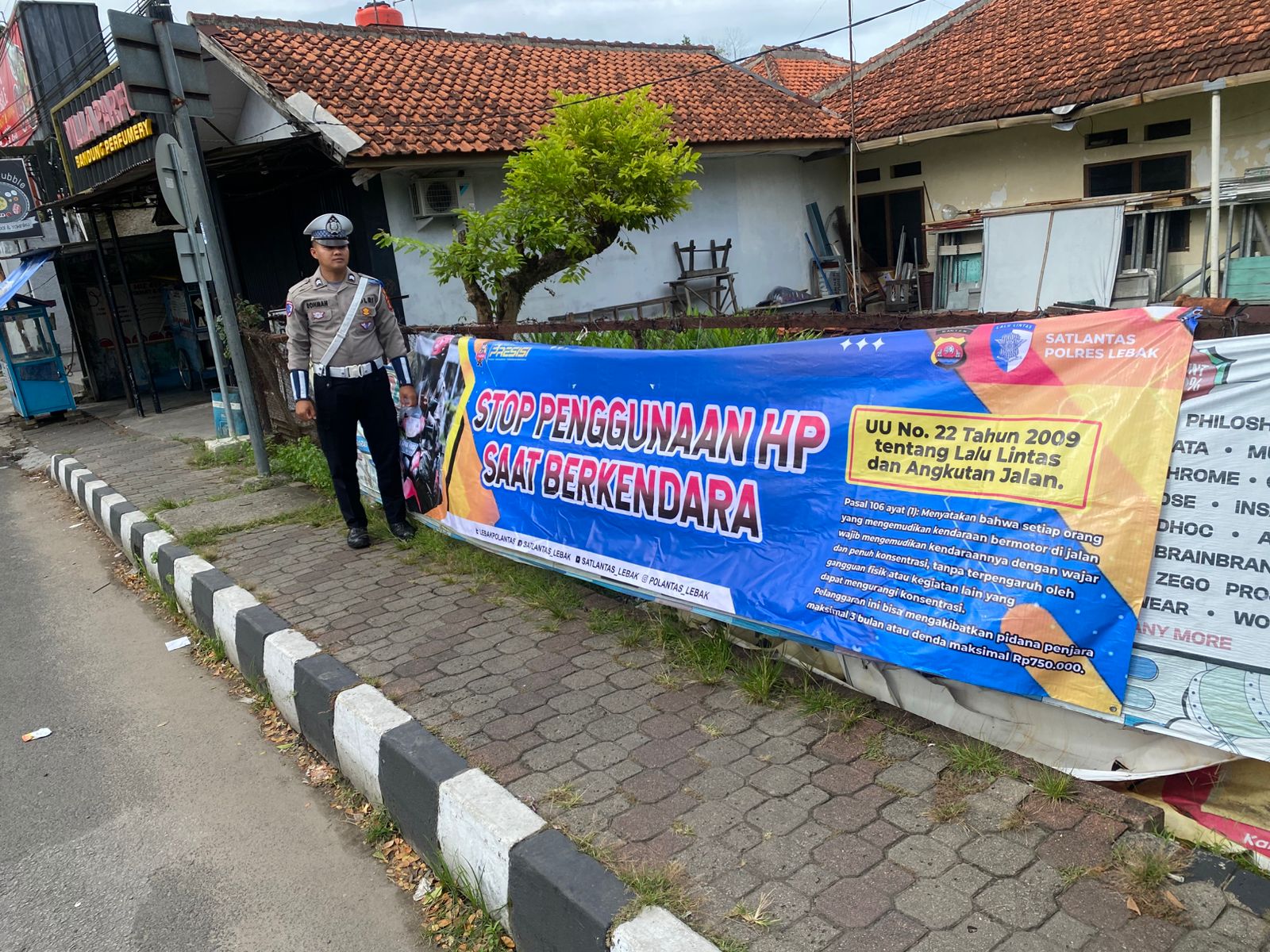 Lebak – Dalam rangkaian Operasi Zebra Maung 2025, Satlantas Polres Lebak berkolaborasi dengan Dinas Perhubungan (Dishub) Kabupaten Lebak serta Jasa Raharja melaksanakan kegiatan imbauan keselamatan berlalu lintas dengan memasang spanduk larangan penggunaan handphone saat berkendara di sejumlah titik strategis wilayah Lebak, di antaranya berlokasi di perapatan Lampu merah PM Rangkasbitung, salah satu jalur utama dengan tingkat aktivitas lalu lintas yang tinggi. Rabu (26/11/2025).